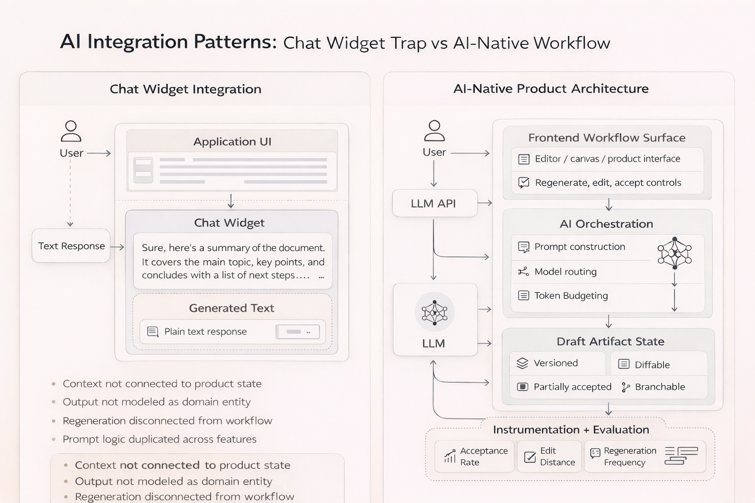AI features can appear as a chat assistant beside a product or as part of the system itself. The difference is not the model. It’s the architecture around it.